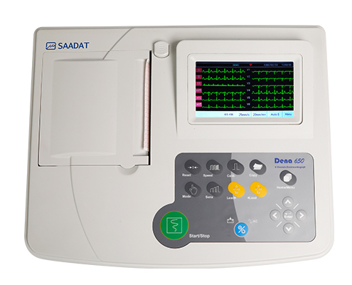 Dena 650 Electrocardiograph is a device designed for displaying and recording six-lead cardiac signals. The device features a thermal printer and offers adjustable speed, mode, and filter settings. This diagnostic instrument is suitable for use in adults, children, and neonates.
