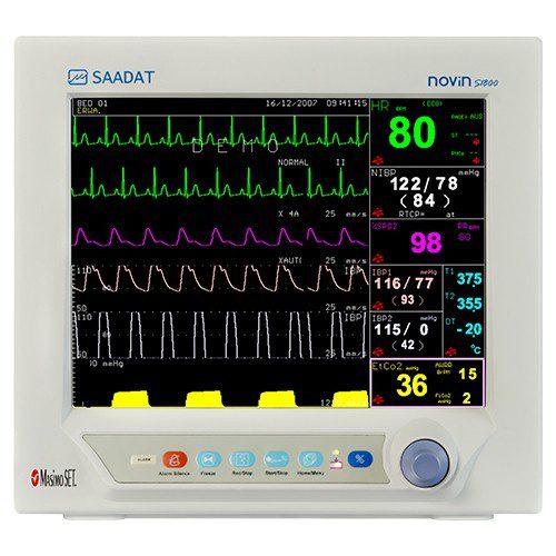 The Novin S1800 Patient Monitor is an Iranian-manufactured vital signs monitor featuring a 10.4-12″ color display, modules for ECG, SpO₂ (Masimo), NIBP, RESP, dual TEMP and dual IBP channels, along with a 96-hour trend memory and central station connectivity.
